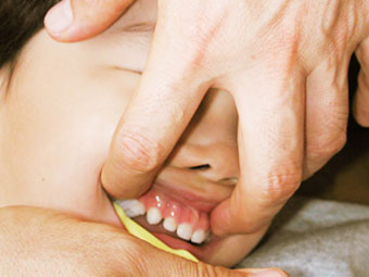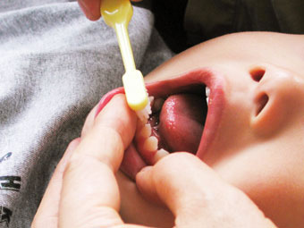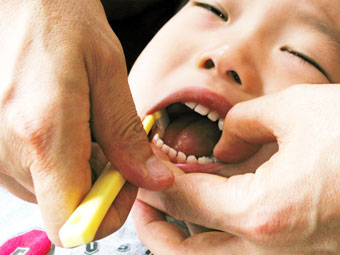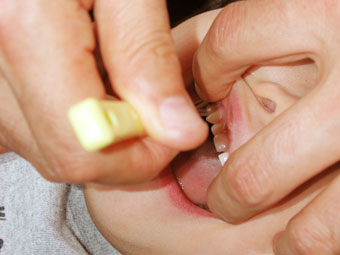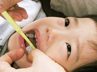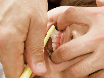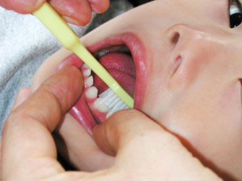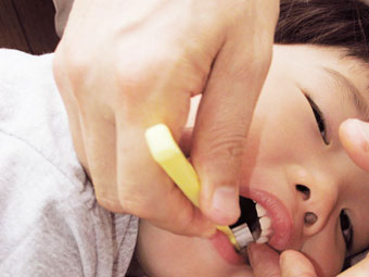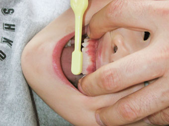 ここで特に注意深く見ていただきたいのが、歯ブラシの持ち方や当て方、唇の押さえ方などです。写真をクリックすると大きな写真をご覧いただけますので、よく見て、お子さんの歯みがきに取り入れてください。